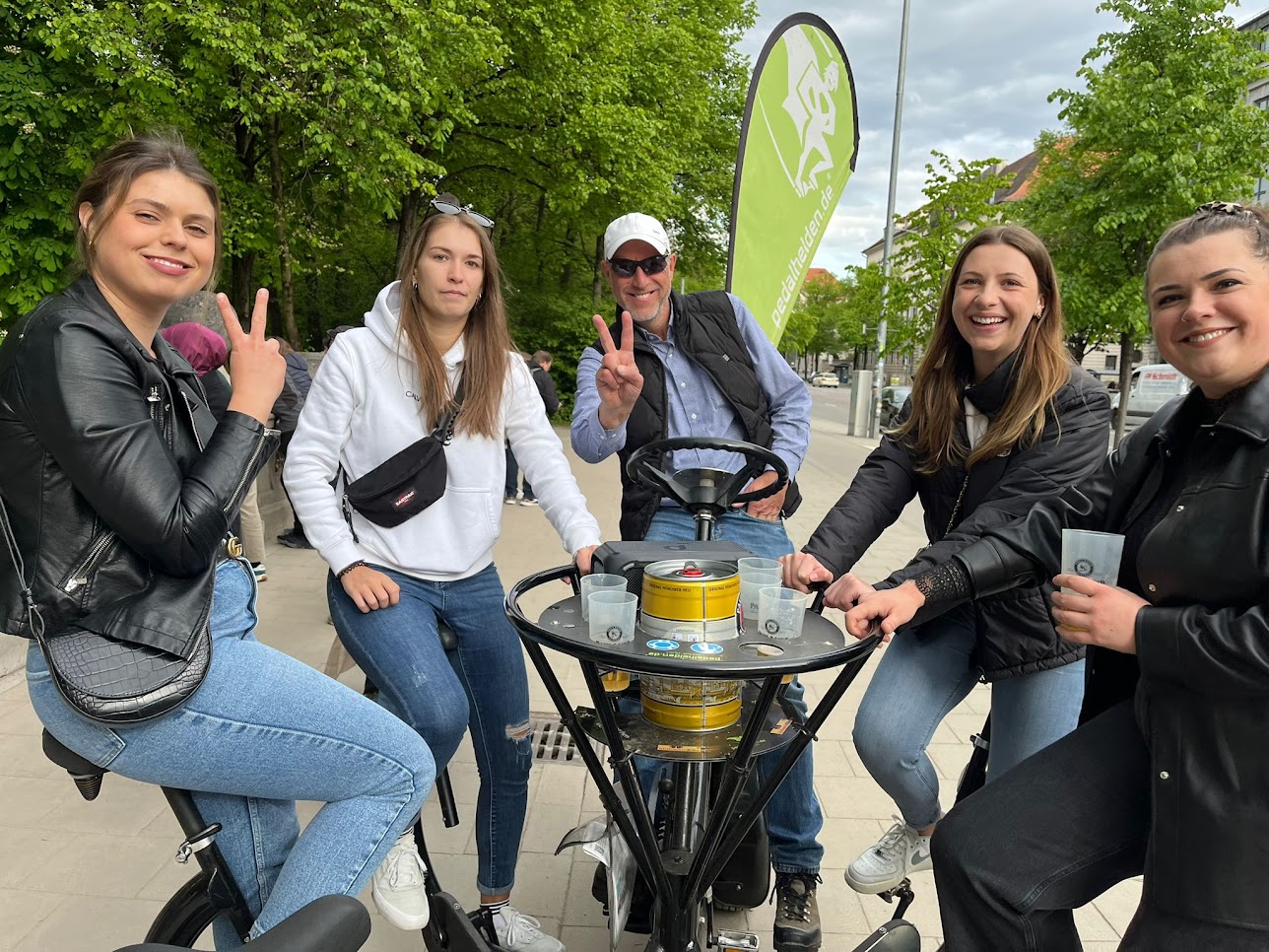 Mit meinem Kooperationspartner „Pedalhelden“ biete ich Conference Bike (CoBi) Touren an, die für bis zu 6 Gästen Platz bieten (Pedalhelden hat bis zu 8 CoBi’s). Erlebt München gemeinsam mit euren Freunden, Kollegen oder der Familie und genießt die lustige und interaktive Tour mit Bier, Prosecco oder sonstigen Getränken durch die Stadt. Auch perfekt geeignet als Junggesellenabschied. Bei Lust und Laune (und entsprechendem Wetter) springe ich mit euch gemeinsam in den Eisbach.